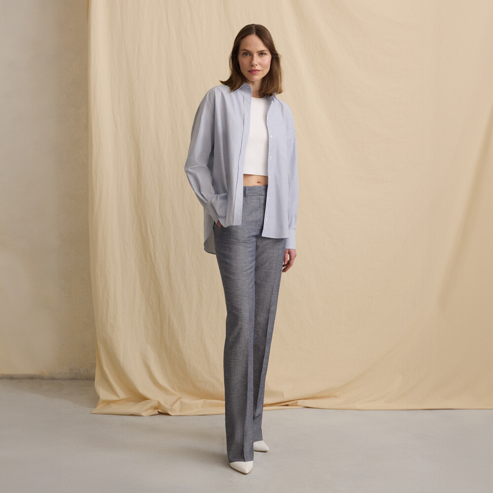 Keten karışımlı dokusu sayesinde mevsim gardırobunuzda vazgeçilmez bir parça olacak. Dylana mavi pantolonu, sezon boyunca birçok kombinde değerlendirebilirsiniz.