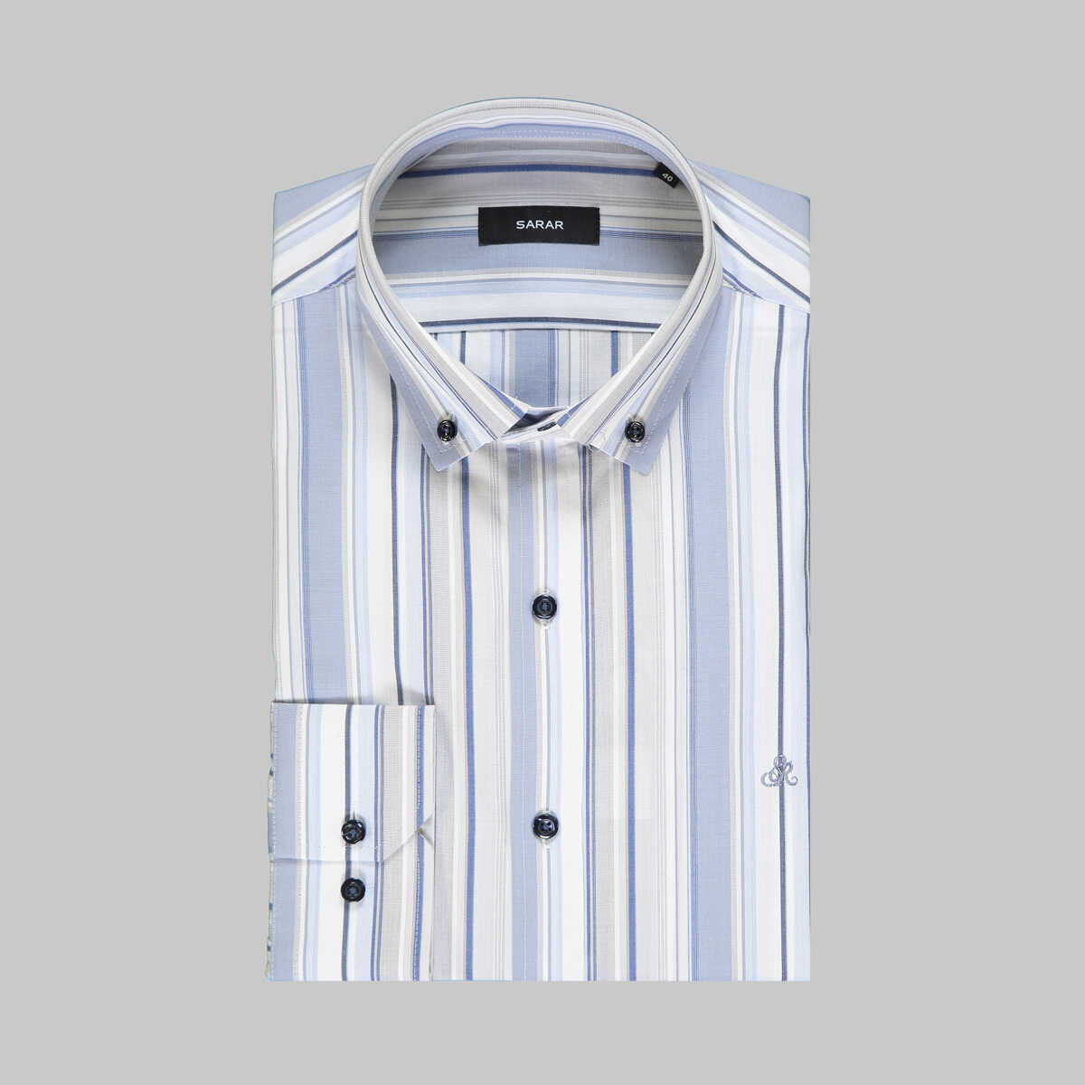 Yaka düğme detaylı çizgili desenli gömlek ile her daim şıklık. Tarz sahibi erkeklerin tercihi SARAR dar kalıp gömlek!