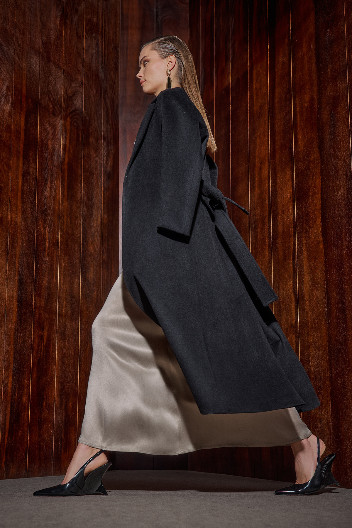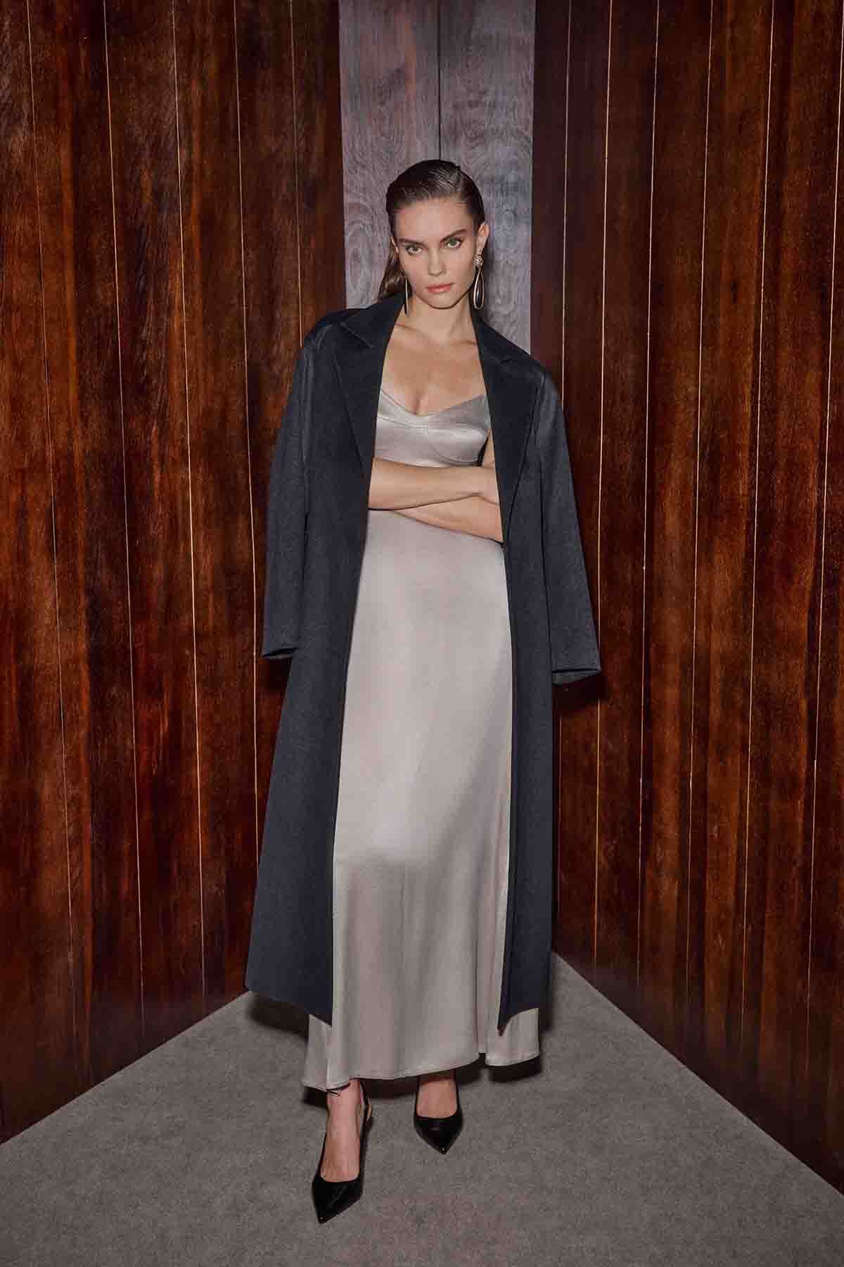 Evellyn Siyah Kaban, yün karışımlı lüks kumaşı ve modern kuşaklı kesimiyle kadın dış giyimde sofistike bir tarz yaratıyor. Siyahın asaleti ile her kombine kolayca uyum sağlıyor. Şık kadın smokin takımları ile kombinleyerek davet stilinizi tamamlayabilir günlük kombinlerinizde ve en soğuk kış davetlerinde bile şıklığınızı en üst seviyede tutabilirsiniz.