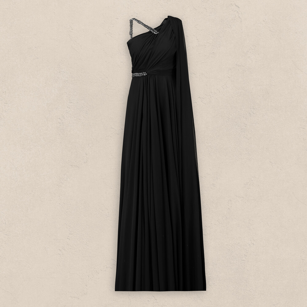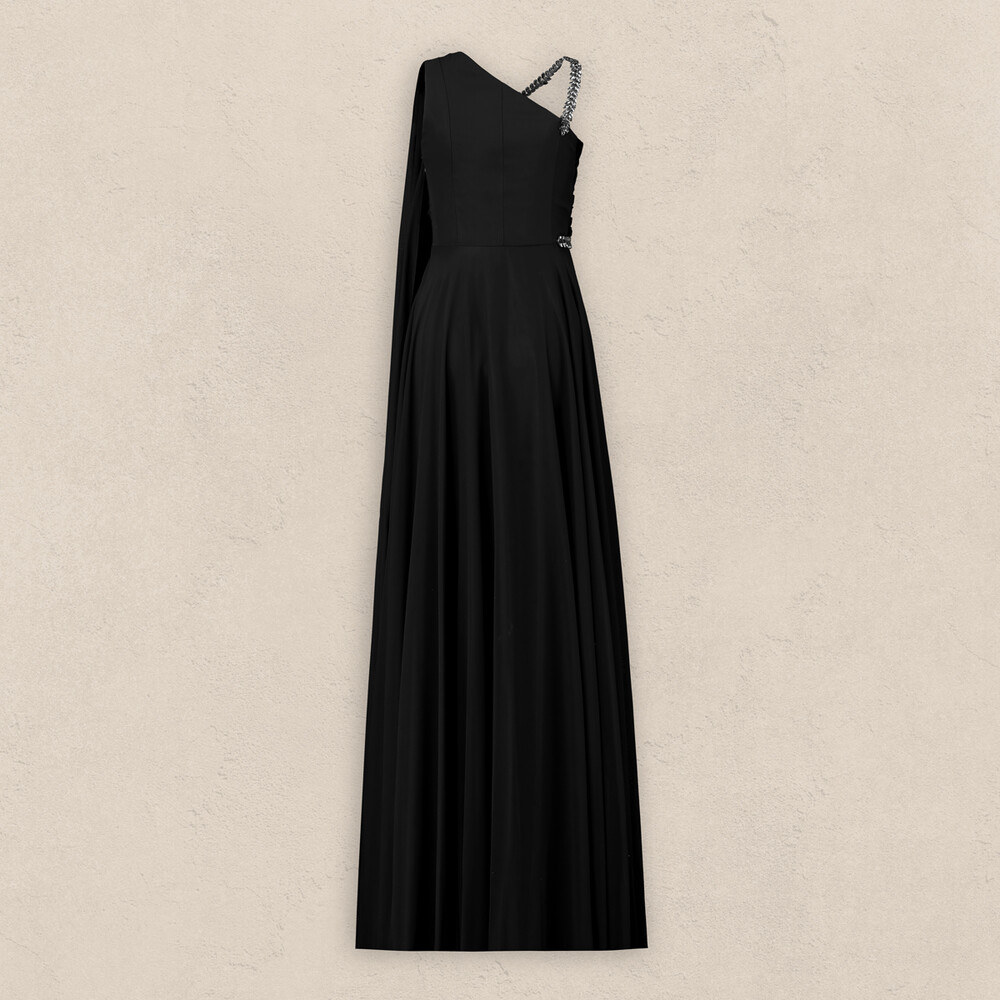 Gelince Haber VerKatleen siyah abiye elbise, tek omuz tasarımıyla zarif ve çarpıcı bir görünüm sunuyor. Omuz ve bel kısmındaki aksesuar detayları, elbiseye şıklık katarken vücut hatlarınızı da zarifçe vurguluyor. Özel davetlerde ve gece etkinliklerinde göz alıcı bir duruş sergilemek isteyenler için ideal bir seçim oluyor.
