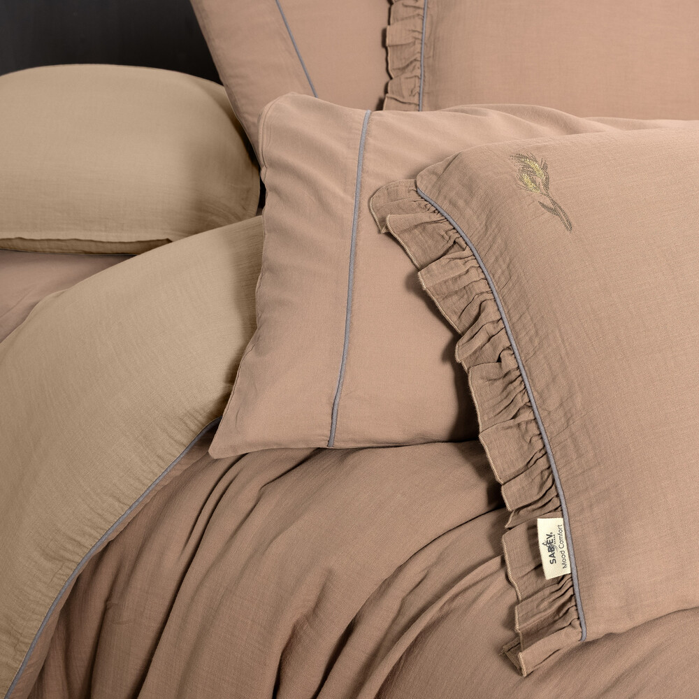 %100 Pamuk, müslin, yıkamalı nevresim takımı. Nevresim kenarlarında biye. Yastık kenarında biye ve fırfır detayı.Yastık ön yüzünde nakış detayı.