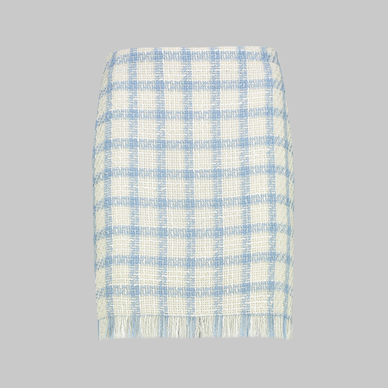 Modern ve şık bir görünüm için Kisha mavi beyaz etek püskül detayıyla hareketleniyor. Eteği, kendi kumaşından olan ceketi ile kombinleyebilirsiniz.