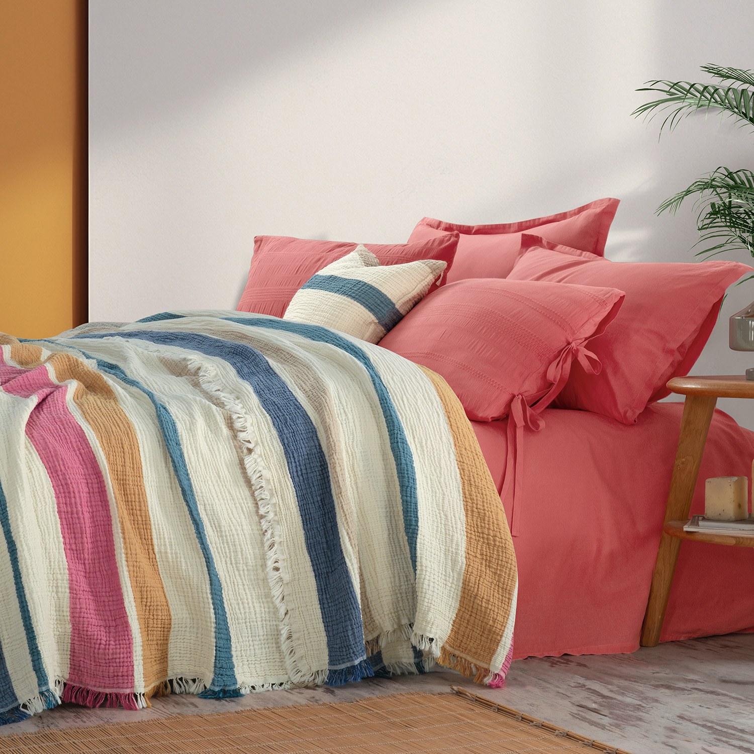 Koleksiyona uygun, güçlü renk geçişleriyle ön plana çıkan yatak örtüleri. Sezon renkleri tercih edildiği için nevresim takımlarıyla rahatlıkla kombinlenebilme imkanı.