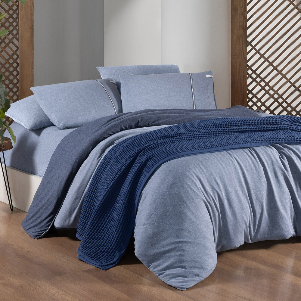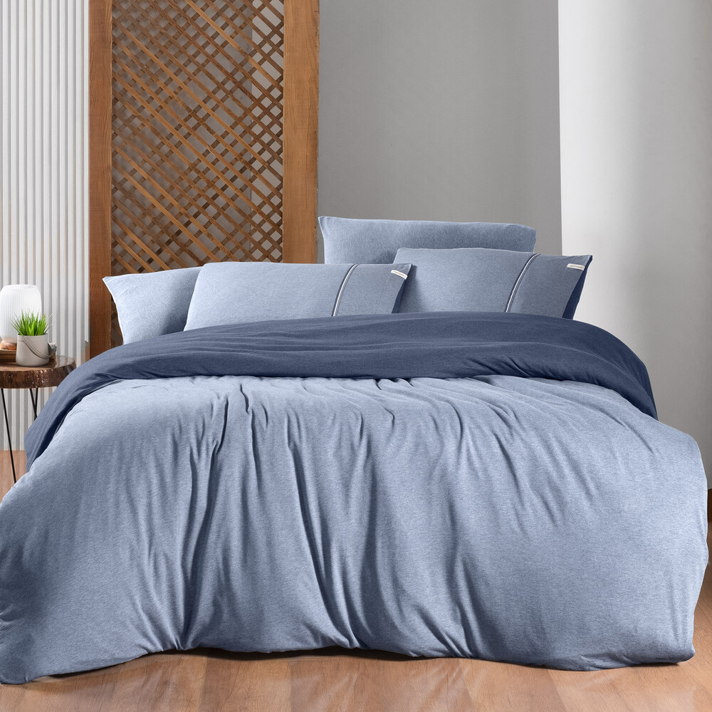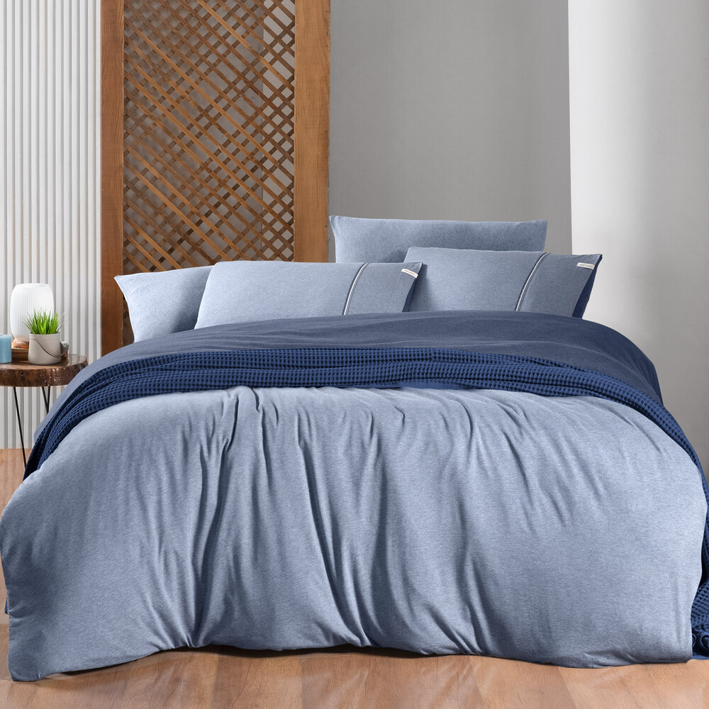 Modal-pamuk,melanj,ipliği boyalı penye nevresim takımı.Yastık kenarında aksesuar detayı.Çift taraflı tasarım.