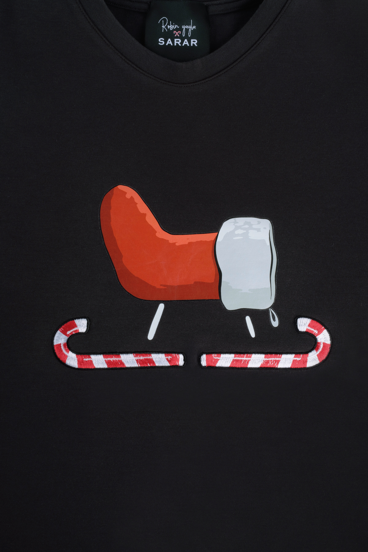 Yeni yılın enerjisini minimal bir tasarım anlayışıyla buluşturan Sarar Robin Yayla tasarımı sweatshirt, kış stiline eğlenceli ama dengeli bir dokunuş katıyor. Göğüs kısmında yer alan kızak figürü ve şeker kamışı detayları, yılbaşı ruhunu sade çizgilerle yansıtarak modern bir görünüm sunuyor.