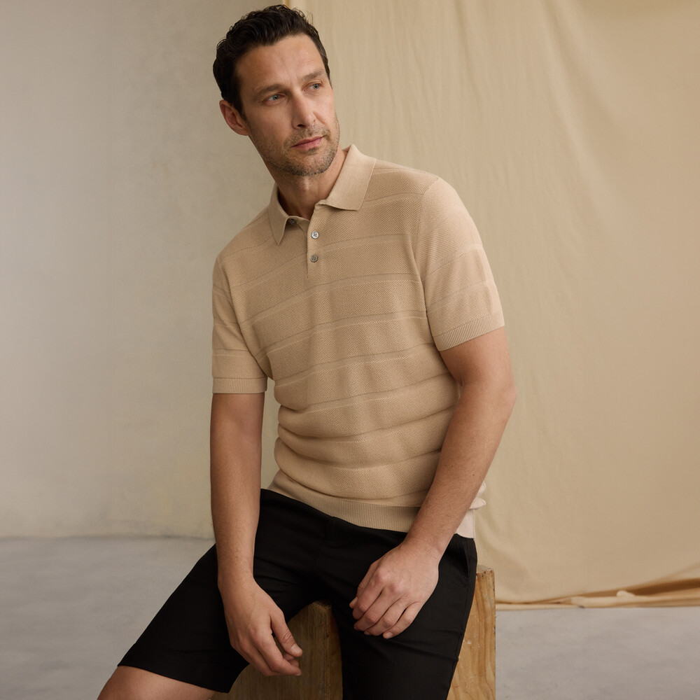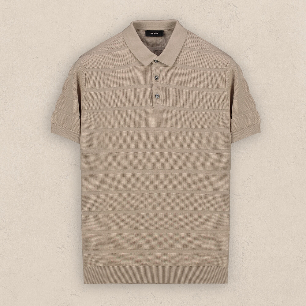 Polo yaka bej tişört,erkek giyiminin vazgeçilmez parçası.Kendinden desenli tasarımı ile dinamik bir şıklık yaşatıyor. Tişörtü denimlerle kombinleyerek sıcak yaz günlerine güçlü bir stil sunabilirsiniz.