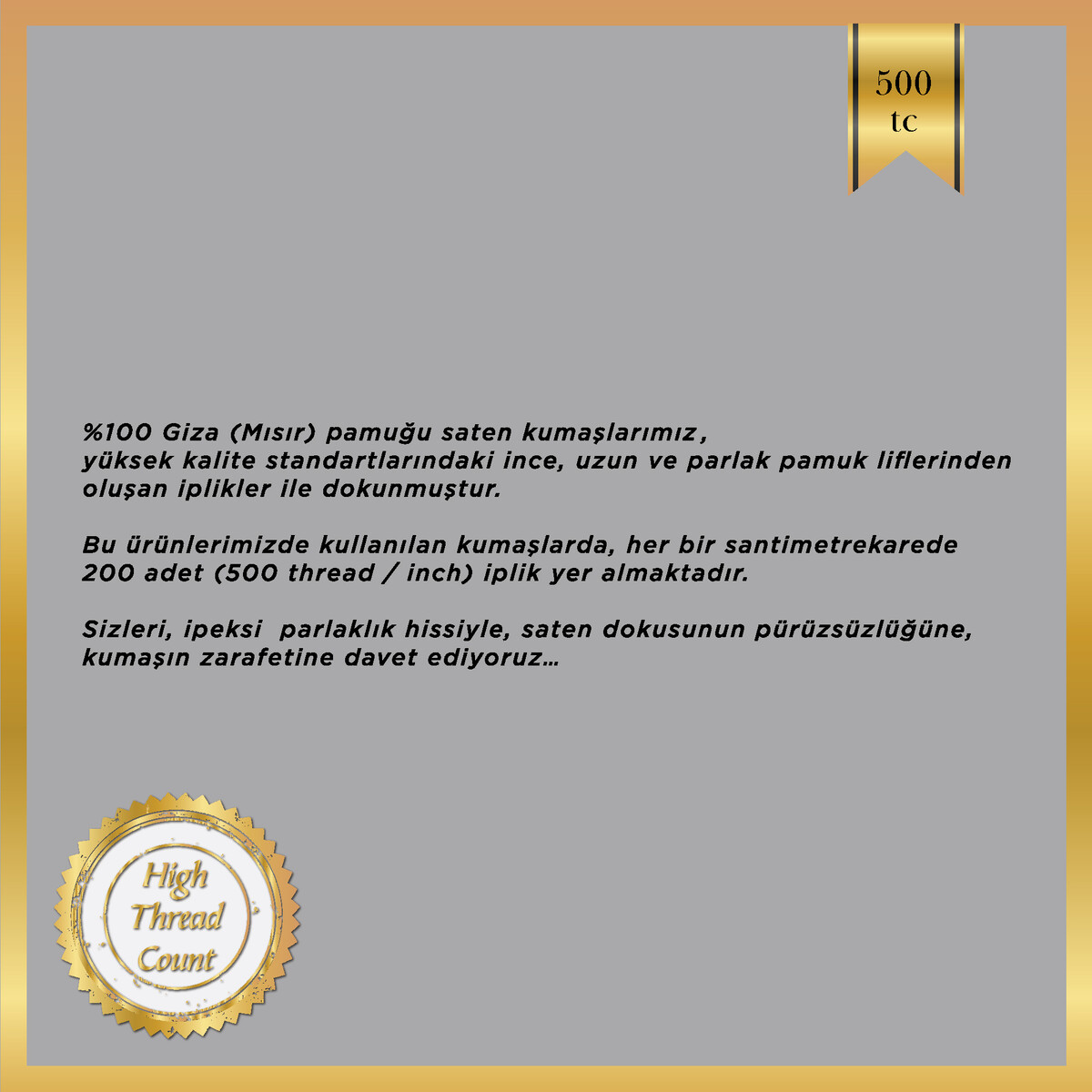 Kumaş Kalitesi;%100 Giza (Mısır) Pamuğu saten kumaşlarımız,yüksek kalite standartlarındaki ince,uzun ve parlak pamuk liflerinden oluşan iplikler ile dokunmuştur.Bu ürünlerimizde kullanılan kumaşlarda her bir cm² de 200 adet (500 thread/inch) iplik yer almaktadır.Sizleri,ipeksi parlaklık hissiyle,saten dokusunun pürüzsüzlüğüne,kumaşın zarafetine davet ediyoruz.