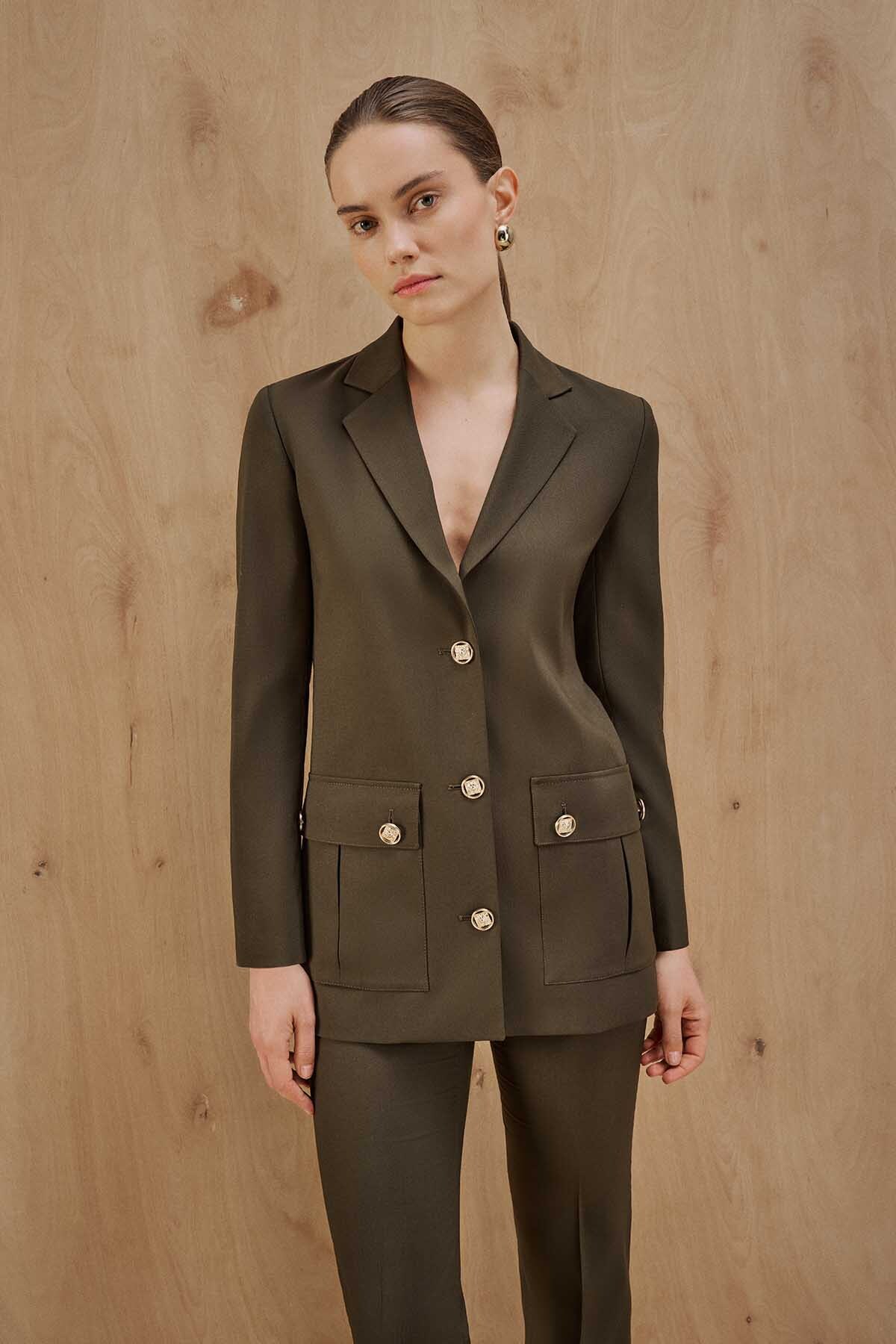 Ön bölümde yer alan kapaklı cep detayları tasarıma fonksiyonellik katarken, altın tonlu aslan kabartmalı düğmeler cekete zarif bir ışıltı ve premium bir görünüm kazandırıyor. Günlük şehir stilinden iş kombinlerine kadar geniş kullanım alanı sunan bu parça, şıklığı konforla tamamlamak isteyen kadınlar için ideal bir seçim.