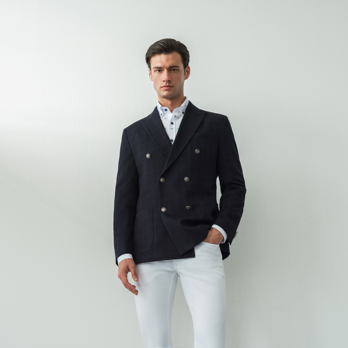 Gelince Haber VerThita koyu lacivert ceket, modern deseni düğmeleriyle birleşerek sizlere sunuluyor. Modası hiç geçmeyen kruvaze ceketi, sporlaştırmak için bir jean pantolon, klasikleştirmek için de bir kumaş pantolon ile kombinleyebilirsiniz.