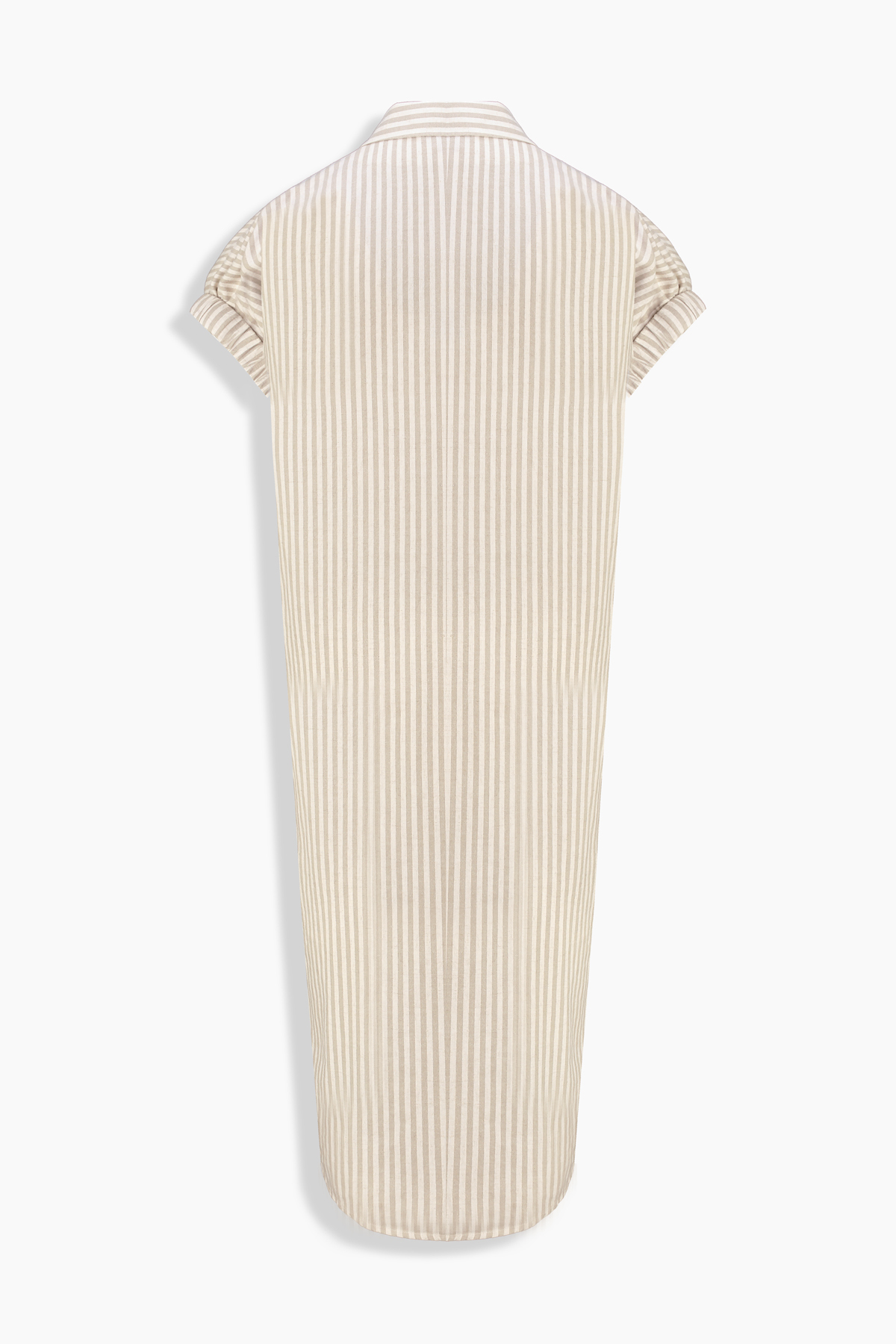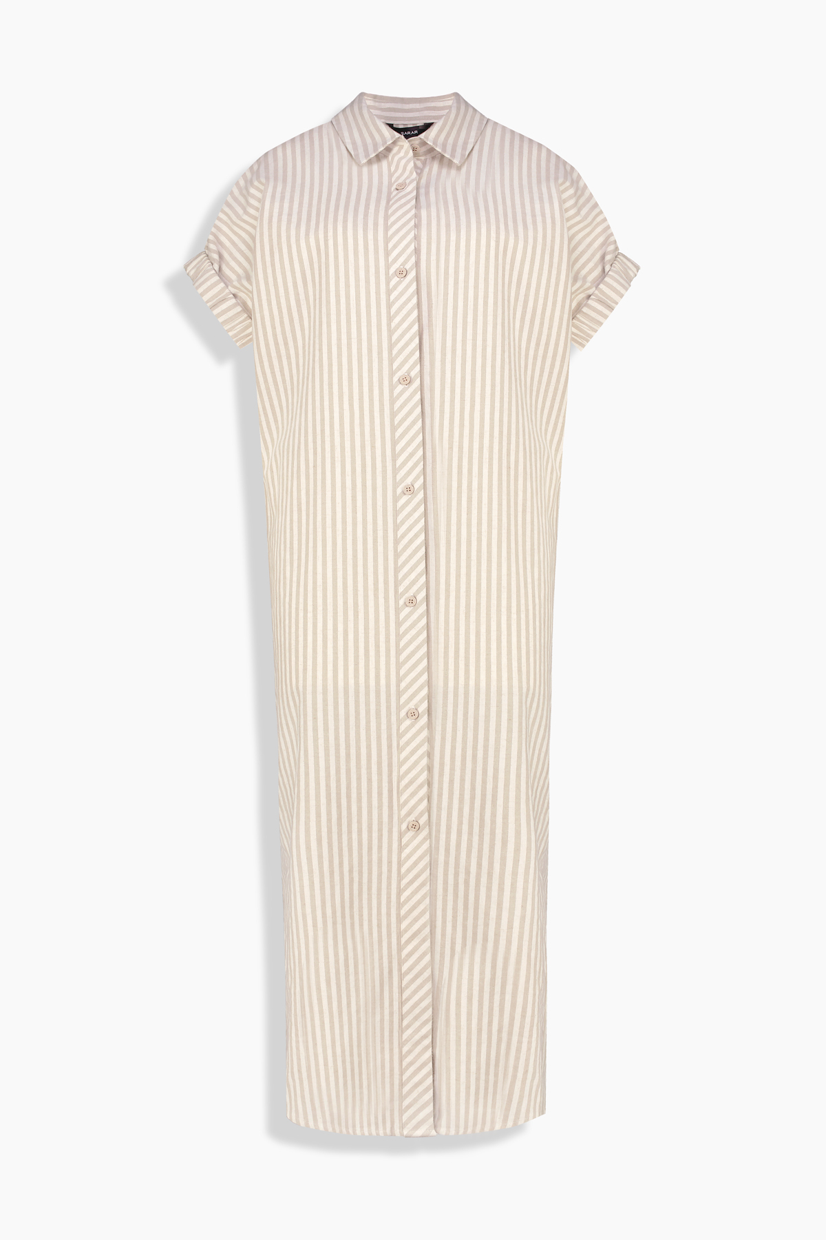 Gale Çizgili Bej Elbise, gömlek yaka ve düğmeli tasarımıyla klasik ve zamansız bir görünüm sunuyor. Pamuk keten karışımlı kumaşıyla gün boyu konfor sunuyor. Hem ofis kombinlerinde hem de günlük kombinlerinizde şıklığınızı tamamlıyor.