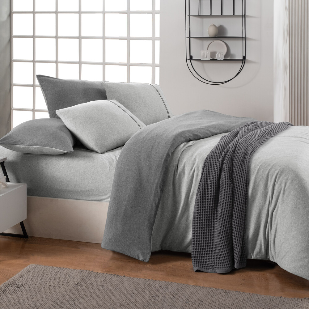 Modal-pamuk,melanj,ipliği boyalı penye nevresim takımı.Yastık kenarında aksesuar detayı.Çift taraflı tasarım.