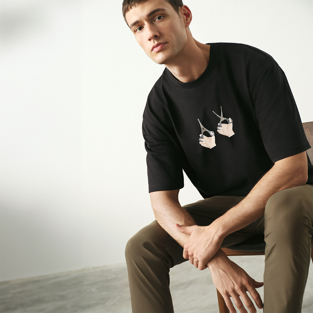 Robin Yayla’nın özgün tasarım anlayışını yansıtan siyah kısa kollu tişört; makas ve eyfel kulesi detayları ile fark yaratıyor. Kısa kol kesimi, regular fit kalıbı ve nefes alabilir pamuk yapısıyla gün boyu konfor sağlıyor. Sınırlı sayıda üretilen ve özel koleksiyonda yer alan eiffel makas tişört, hem rahat hem de stil sahibi bir görünüm sunuyor.