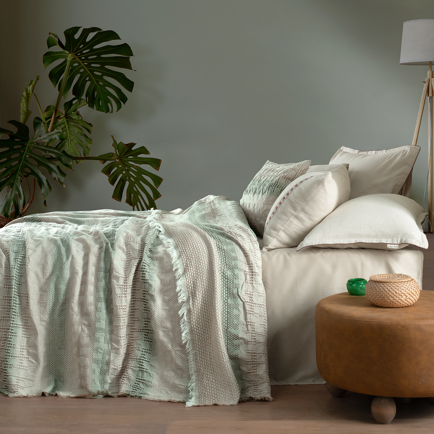 • Jakarlı, yıkamalı, müslin yatak örtüsü.