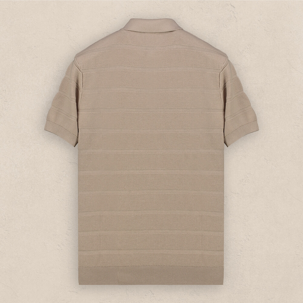 Polo yaka bej tişört,erkek giyiminin vazgeçilmez parçası.Kendinden desenli tasarımı ile dinamik bir şıklık yaşatıyor. Tişörtü denimlerle kombinleyerek sıcak yaz günlerine güçlü bir stil sunabilirsiniz.